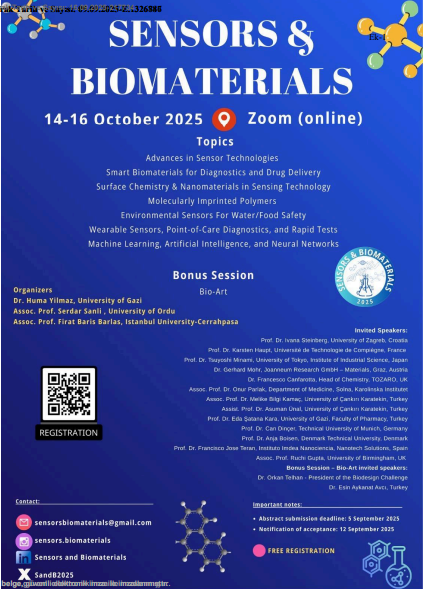 Gazi Üniversitesi Eczacılık Fakültesi Temel Eczacılık Bilimleri Bölümü, Analitik Kimya Anabilim Dalı Araştırma Görevlisi Dr. Hüma YILMAZ, İstanbul Üniversitesi Cerrahpaşa Nanoteknoloji ve Biyoteknoloji Enstitüsü öğretim üyesi Doç. Dr. Fırat Barış BARLAS ve Ordu Üniversitesi Fen Edebiyat Fakültesi öğretim üyesi Doç. Dr. Serdar ŞANLI ortaklığı ile Gazi Üniversitesi ev sahipliğinde 14-16 Ekim 2025 tarihinde çevrimiçi gerçekleştirilecek olan "International Sensors & Biomaterials" adlı konferans düzenlenecektir.