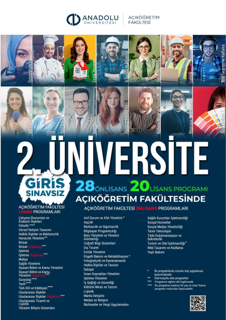 Anadolu Üniversitesi Açıköğretim Fakültesi olarak, eğitimde fırsat eşitliği ve hayat boyu öğrenme misyonu doğrultusunda, Türk yükseköğretim sistemine yenilikçi ve erişilebilir çözümler sunmaya devam ediyor. Bu çerçevede, Giriş Sınavsız İkinci Üniversite uygulaması kapsamında, Yükseköğretime erişimi kolaylaştırmak ve hayat boyu öğrenme olanaklarını toplumun her kesimine ulaştırmak amacıyla sunduğu Açıkögretim programları, Ülkemizin eğitim politikaları doğrultusunda önemli bir misyon üstlenmektedir. Ayrıca, halihazırda bir yükseköğretim programına kayıtlı öğrencilerin mevcut kayıtlarını bozmadan Açıköğretim programlarımızdan birine başvurarak ikinci bir uzmanlık alanı edinmelerine olanak tanımaktadır.