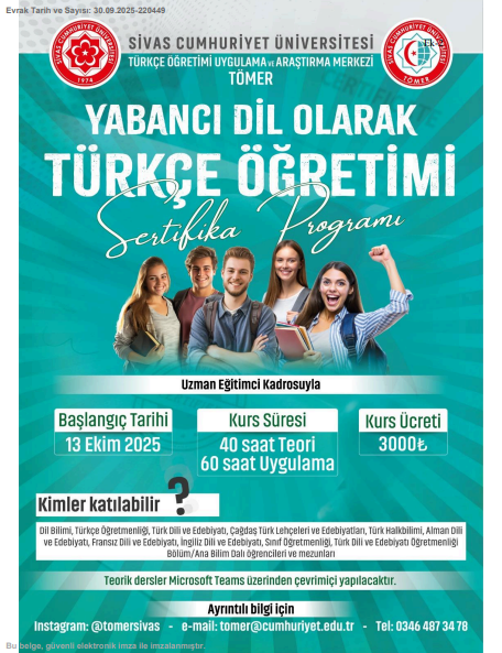 Sivas Cumhuriyet Üniversitesi Türkçe Öğretimi Uygulama ve Araştırma Merkezi tarafından 13 Ekim-10 Kasım 2025 tarihleri arasında düzenlenmesi planlanan "Yabancı Dil Olarak Türkçe Öğretimi Sertifika Programı"na 13 Ekim 2025 tarihine kadar başvuru yapılabilecektir.