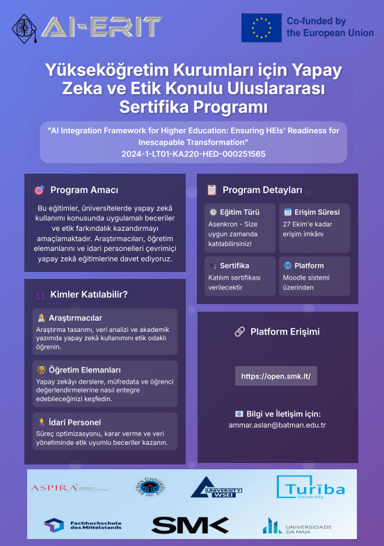 Batman Üniversitesi paydaş olduğu ve yürütücülüğünü Dr. Öğr. Üyesi Yusuf SÖZER' in yapmış olduğu AB Erasmus+ 2024-1-LT01-KA220-HED-000251565 referans numaralı "AI Integration Framework for Higher Education: Ensuring HEIs' Readiness for Inescapable Transformation" (AI-ERIT) adlı proje kapsamında hazırlanan yapay zeka ve etik konulu eğitimler düzenlenecektir.
