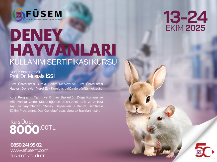 Fırat Üniversitesi Sürekli Eğitim Merkez Müdürlüğü bünyesinde açılacak olan Deney Hayvanları Kullanım Sertifika Eğitim kursu düzenlenecektir.
