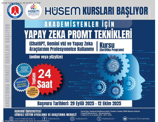 Hakkari Üniversitesi Sürekli Eğitim Uygulama ve Araştırma Merkezi Müdürlüğü tarafından 2025-2026 Güz Döneminde açılacak olan ''Akademisyenler için Yapay Zeka Promt Teknikleri (ChatGPT, Gemini vb ) ve Yapay Zeka Araçlarının Profesyonelce Kullanımı'' kursu açılmıştır.