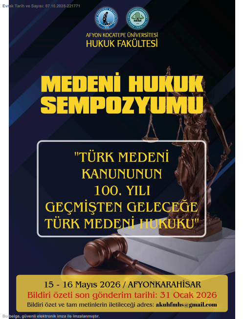 Afyon Kocatepe Üniversitesi Hukuk Fakültesi Sempozyum Koordinatörü Dr. Öğr. Üyesi Sena AKKIŞLA öncülüğünde, 2026 yılının Türk Medeni Kanunu'nun yürürlüğe girişinin 100. yılı olması nedeniyle 15–16 Mayıs 2026 tarihlerinde "Türk Medeni Kanunu'nun 100. Yılı: Geçmişten Geleceğe Türk Medeni Hukuku" başlıklı ulusal düzeyde doçentlik başvuru kriterlerine uygun biçimde akademik bir sempozyum düzenlenecektir.