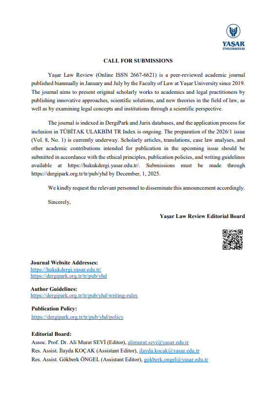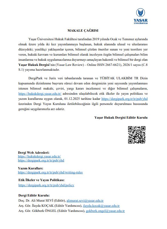 Yaşar Üniversitesi Hukuk Fakültesine ait "Yaşar Hukuk Dergisi"nin 2026 Ocak ayında yayımlanacak olan 2026/1 sayısına ilişkin Türkçe ve İngilizce hazırlanmış çağrı metinleri aşağıda belirtilmiştir.