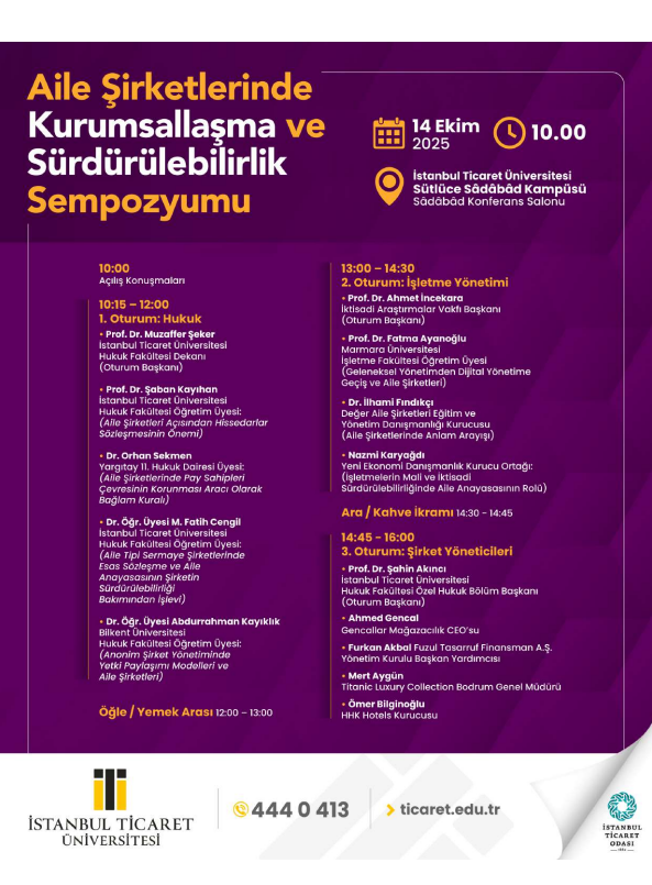 İstanbul Ticaret Üniversitesi Hukuk Fakültesi tarafından 14 Ekim 2025 tarihinde “Aile Şirketlerinde Kurumsallaşma ve Sürdürülebilirlik” başlıklı sempozyum gerçekleştirilecektir.