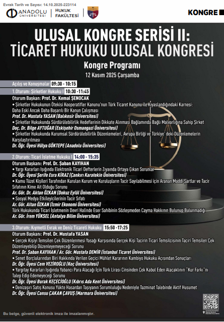Anadolu Üniversitesi Hukuk Fakültesi tarafından 12-14 Kasım 2025 tarihleri arasında yapılması planlanan "Anadolu Üniversitesi Hukuk Fakültesi Ulusal Kongre Serisi II: Ticaret Hukuku Ulusal Kongresi''ne ilişkin kongre düzenlenecektir.