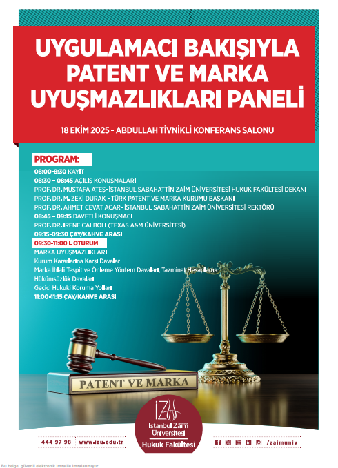 İstanbul Sabahattin Zaim Üniversitesi ev sahipliğinde, 18 Ekim 2025 Cumartesi günü Türk Patent ve Marka Kurumu Başkanı, Bölge Adliye Mahkemesi ilgili daire başkan ve üyeleri, Fikri ve Sınai Haklar Hukuk Mahkemesi hâkimleri, patent ve marka vekilleri ile akademisyenlerin katılımlarıyla yüz yüze gerçekleştirilecek olan "Uygulamacı Bakışıyla Patent ve Marka Uyuşmazlıkları Paneli" düzenlenecektir.