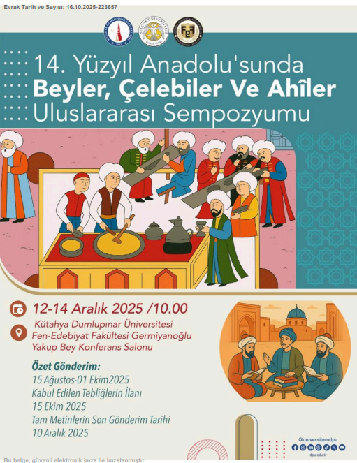 Kütahya Dumlupınar Üniversitesi ve Selçuk Üniversitesi iş birliği ile 12-14 Aralık 2025 tarihleri arasında Fen Edebiyat Fakültesi Germiyanoğlu Yakup Bey Konferans Salonu'nda ''14. Yüzyıl Anadolusu'nda Beyler, Çelebiler ve Ahiler Uluslararası Sempozyumu''nun düzenlenmesi planlanmaktadır.