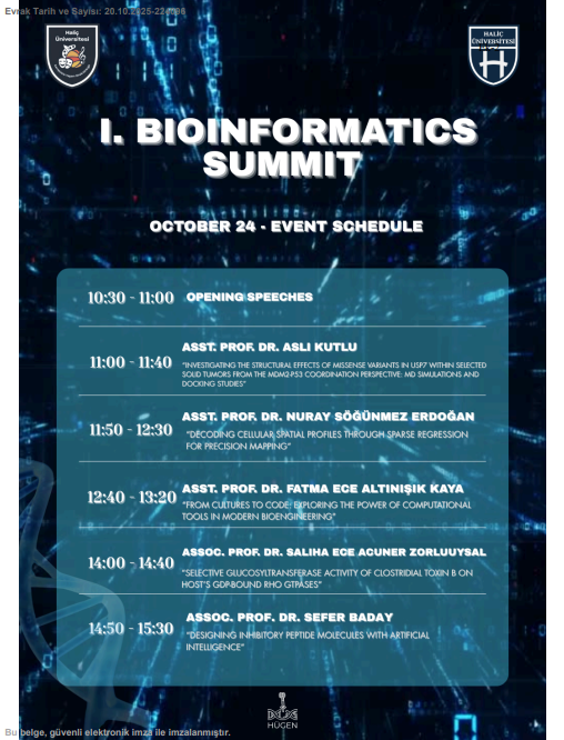 Haliç Üniversitesi Genetik Topluluğu (HÜGEN) tarafından 24 Ekim 2025 tarihinde düzenlenecek olan "I. Bioinformatics Summit" etkinliği; çeşitli üniversitelerden Genetik, Veri Bilimi ve Biyoteknoloji alanlarında öncü akademisyenlerin katılımıyla gerçekleştirilecektir.