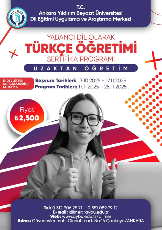 Ankara Yıldırım Beyazıt Üniversitesi Dil Eğitimi Uygulama ve Araştırma Merkezi (DİLMER) tarafından 17.11.2025-28.11.2025 tarihleri arasında "Yabancılara Türkçe Öğretimi Sertifika Programı" düzenlenecektir. Kurs 30 saat teorik, 30 saat uygulama şeklinde düzenlenecek olup teorik kısmı hafta içi 17.30-19.20 saatleri arasında yürütülecektir.