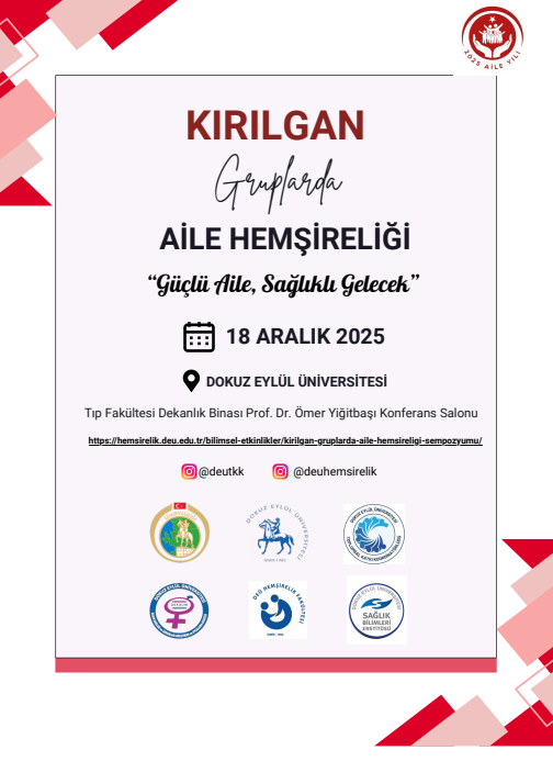 Ülkemizde 2025 yılının "Aile Yılı" olarak ilan edilmesi kapsamında İzmir Valiliği, İzmir Aile ve Sosyal Hizmetler İl Müdürlüğü ile Dokuz Eylül Üniversitesi; Hemşirelik Fakültesi, Sağlık Bilimleri Enstitüsü, Kadın ve Aile Çalışmaları Uygulama ve Araştırma Merkezi, Toplumsal Katkı Koordinatörlüğü iş birliğinde "Güçlü aile, sağlıklı gelecek" teması ile gerçekleştirilecek olan "Kırılgan Gruplarda Aile Hemşireliği" başlıklı sempozyum, 18 Aralık 2025 tarihinde DEÜ Tıp Fakültesi Prof. Dr. Ömer Yiğitbaşı Konferans Salonu'nda gerçekleştirilecektir.