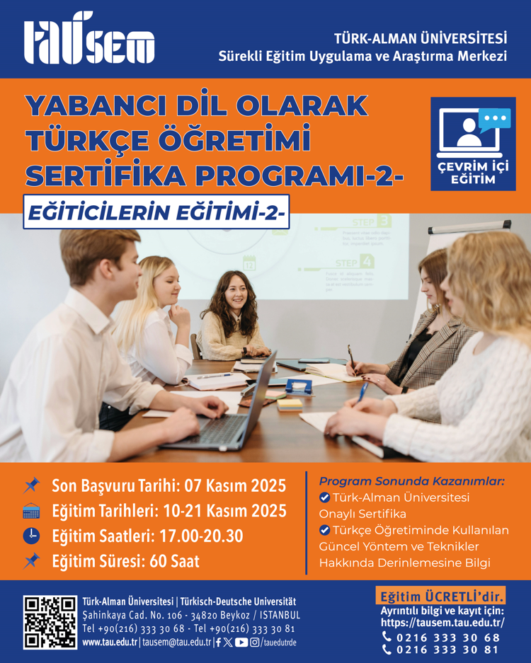 Türk-Alman Üniversitesi Sürekli Eğitim Merkezi tarafından Yabancı Dil Olarak Türkçe Öğretimi Sertifika Programı'nın ikincisi başlatılacak olup programa ilişkin bilgilere https://tausem.tau.edu.tr/tr adresinden ulaşılabilmektedir.