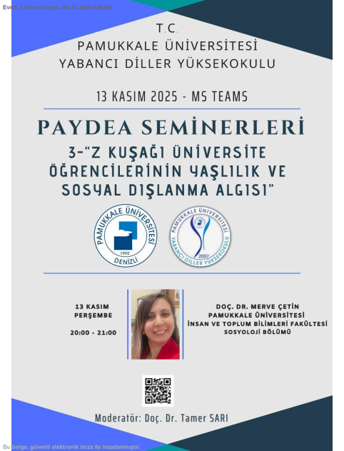 Pamukkale Üniversitesi Yabancı Diller Yüksekokulu Akademik ve Sosyal Aktivite Koordinatörlüğü'nün 2025-2026 Eğitim Öğretim Yılında Microsoft Teams platformu üzerinden çevrimiçi olarak düzenleyeceği Pamukkale Üniversitesi Yabancı Diller Yüksekokulu Dil ve Edebiyat Araştırmaları (PAYDEA) seminerlerinin üçüncüsü "Z Kuşağı Üniversite Öğrencilerinin Yaşlılık ve Sosyal Dışlanma Algısı" adlı seminer 13 Kasım 2025 Perşembe günü saat 20.00'de gerçekleştirilecektir.