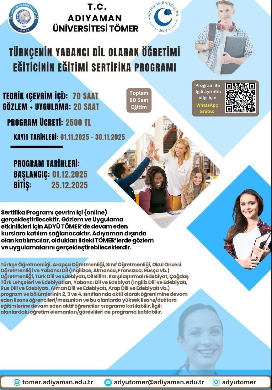 Üniversitemiz Türkçe Öğretimi Uygulama ve Araştırma Merkezi (ADYÜ TÖMER) tarafından düzenlenecek olan "Türkçenin Yabancı Dil Olarak Öğretimi Eğiticinin Eğitimi Sertifika Programı/2", yabancı dil olarak Türkçe öğretimi alanında akademik ve mesleki gelişimi desteklemek amacıyla planlanmıştır.