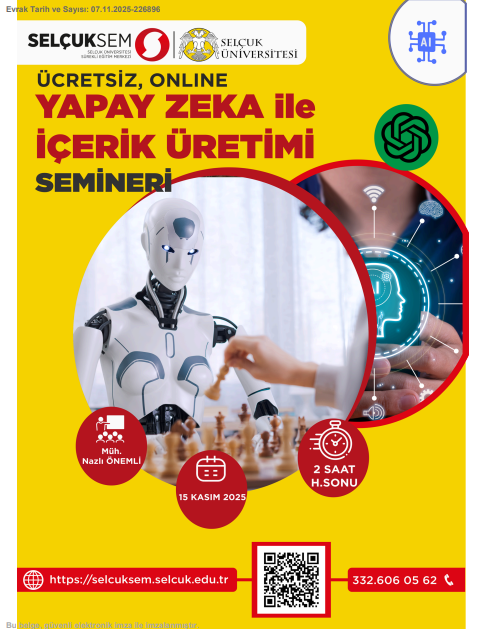 Selçuk Üniversitesi Sürekli Eğitim Uygulama ve Araştırma Merkezi Müdürlüğü tarafından, günümüzün hızla gelişen dijital dönüşüm sürecine katkı sağlamak amacıyla "Yapay Zekâ ile İçerik Üretimi" başlıklı ücretsiz ve çevrim içi bir seminer programı düzenlenmesi planlanmaktadır. Seminer programı 15 Kasım 2025 Cumartesi günü saat 13:00-15:00 saatleri arasında genel katılıma açık düzenlenecektir.