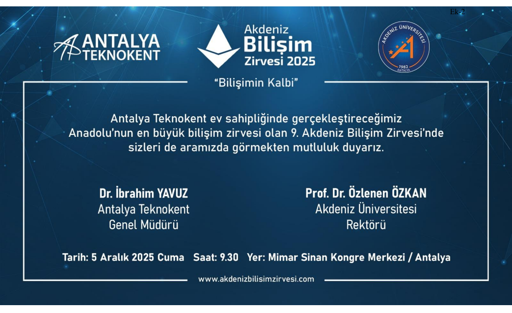 Akdeniz Üniversitesi Antalya Teknokent tarafından, Anadolu'nun en büyük bilişim zirvesi haline gelen "Akdeniz Bilişim Zirvesi"nin 9.'sunun 05 Aralık 2025 Cuma günü Mimar Sinan Kongre Merkezi'nde gerçekleştirilecektir. Ayrıca Bölgemizin bilişim ekosistemine yön veren zirvenin; sektör profesyonelleri, akademisyenler, kurum temsilcileri ve öğrenciler için önemli bir buluşma ve etkileşim platformu oluşturmaya devam ettiği, bu yıl da bilişim alanındaki güncel gelişmelerin, yenilikçi uygulamaların ve sektörel gelişmelerin ele alınacağı kapsamlı bir program planlanacaktır.