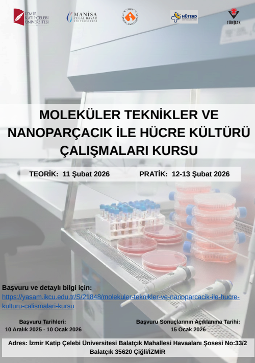 TÜBİTAK 2237 Eğitim Etkinlikleri Destekleme Programı kapsamında İzmir Katip Çelebi Üniversitesi Hücre, Doku ve Organ Nakli Uygulama ve Araştırma Merkezi ev sahipliğinde İzmir Katip Çelebi Üniversitesi Tıp Fakültesi, Manisa Celal Bayar Üniversitesi, İzmir Ekonomi Üniversitesi ve Hücresel Tedaviler Eğitim ve Araştırma Derneği tarafından 11-13 Şubat 2026 tarihlerinde “Moleküler Teknikler ve Nanoparçacık ile Hücre Kültürü Çalışmaları” kursu gerçekleştirilecektir.
