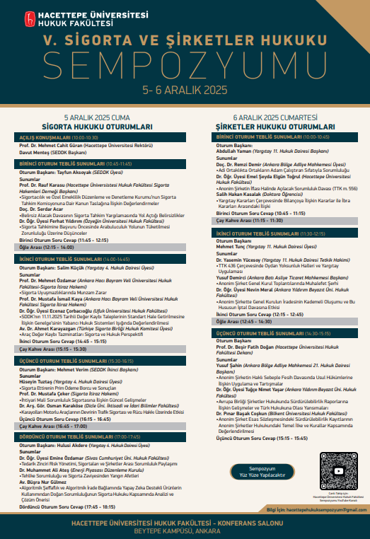 Hacettepe Üniversitesi Hukuk Fakültesi Ticaret Hukuku Ana Bilim Dalı tarafından 05-06 Aralık 2025 tarihlerinde, Yargıtay 4. ve 11. Hukuk Daireleri, Sigortacılık ve Özel Emeklilik Düzenleme ve Denetleme Kurumu ile Türkiye Sigorta Birliği’nin katkılarıyla “V. Sigorta ve Şirketler Hukuku Sempozyumu” düzenlenecektir.