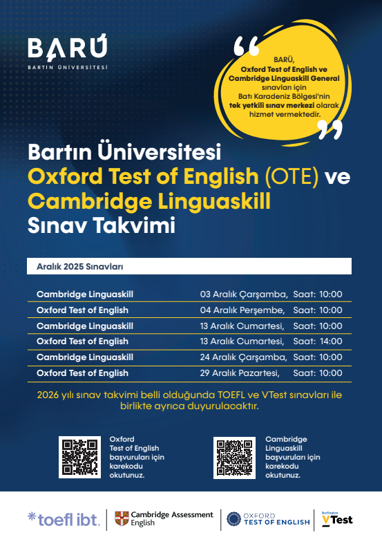 Bartın Üniversitesi yenilikçi eğitim vizyonuyla, ulusal geçerliliğe sahip ve ÖSYM tarafından eşdeğerliği olan TOEFL iBT, Oxford Test of English ve Cambridge Linguaskill General dil sınavlarına yetkili sınav merkezi olarak ev sahipliği yapmaktadır. Söz konusu sınavlardan Aralık ayı içerisinde gerçekleştirilecek olan “Oxford Test of English (OTE)” ve “Cambridge Linguaskill General” sınavları düzenlenecektir.