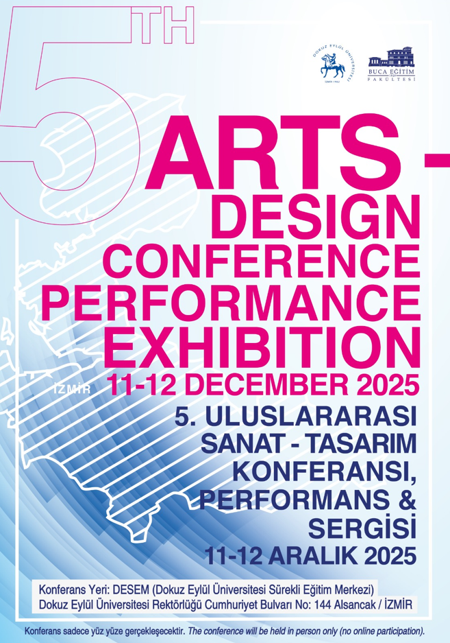 Dokuz Eylül Üniversitesi Buca Eğitim Fakültesi Güzel Sanatlar Eğitimi Bölümü tarafından 11-12 Aralık 2025 tarihlerinde "5. Uluslararası Sanat - Tasarım Konferansı, Performans ve Sergisi (IADCE)" Dokuz Eylül Üniversitesi Rektörlüğü Sürekli Eğitim Merkezi (DESEM) 15 Temmuz Şehitler Salonu ve Fuaye alanında gerçekleştirilecektir.