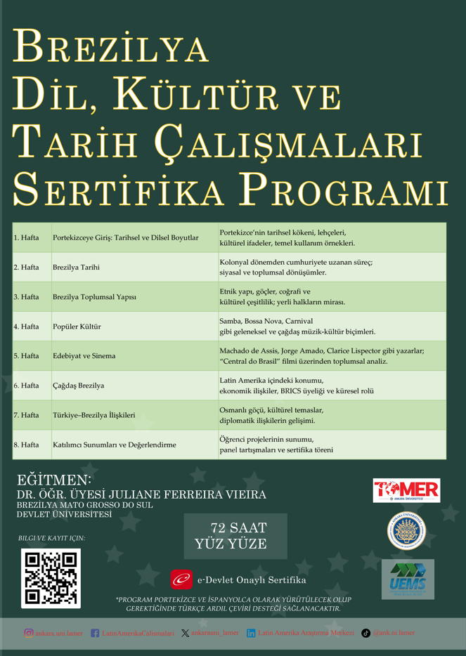 Ankara Üniversitesi Türkçe ve Yabancı Dil Uygulama ve Araştırma Merkezi (TÖMER) ile Latin Amerika Çalışmaları Araştırma ve Uygulama Merkezi işbirliği ile 08 Aralık 2025-30 Ocak 2026 tarihleri arasında "Brezilya Dil, Kültür ve Tarih Çalışmaları" başlıklı sertifika programı düzenlenecektir.