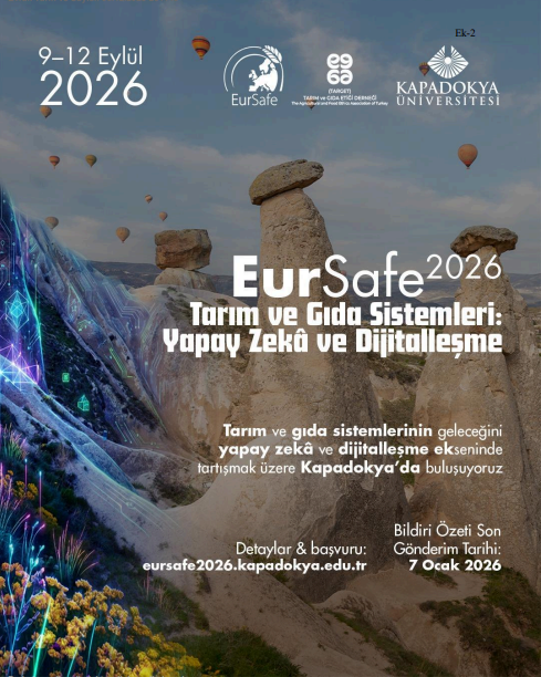 Kapadokya Üniversitesi ev sahipliğinde 9-12 Eylül 2026 tarihlerinde Ürgüp/Nevşehir'de "EurSafe 2026: Tarım ve Gıda Sistemleri: Yapay Zekâ ve Dijitalleşme" başlıklı uluslararası konferans düzenlenecektir.