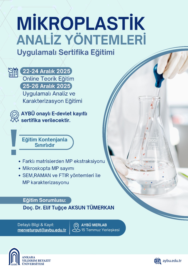 Ankara Yıldırım Beyazıt Üniversitesi Merkezi Araştırma Laboratuvarı Uygulama ve Araştırma Merkezi tarafından yürütülmekte olan "Mikroplastik Analiz Yöntemleri Uygulamalı Sertifika Eğitimi" kapsamında eğitim faaliyetleri düzenlenecektir.