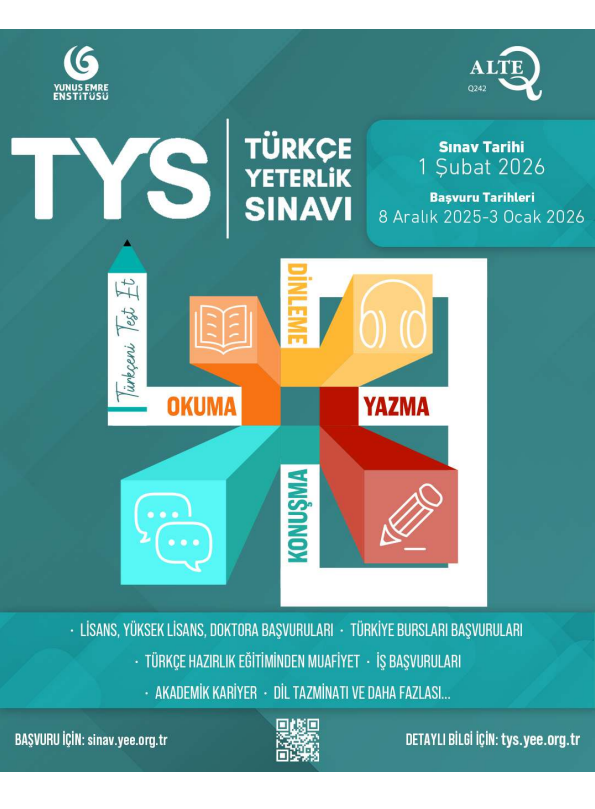 Yunus Emre Enstitüsü Başkanlığının başvuruları 28 Aralık 2025- 3 Ocak 2026 tarihleri arasında alınacak ve 1 Şubat 2026 tarihinde Türkiye dışındaki sınav merkezleri ile yurt içinde gerçekleştirilecek olan Türkçe Yeterlik Sınavı'na (TYS) yapılacaktır.