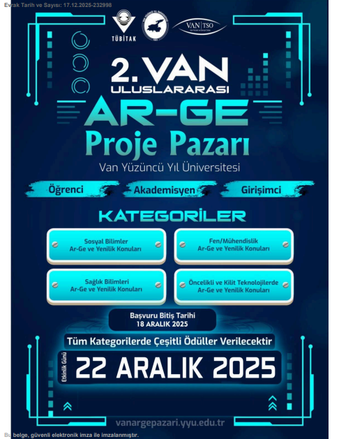 Van Yüzüncü Yıl Üniversitesince 22 Aralık 2025 tarihinde 10.00–18.00 saatleri arasında Prof.Dr. Cengiz Andiç Kültür Merkezinde "2. Van Uluslararası Ar-Ge Proje Pazarı" düzenlenecektir.