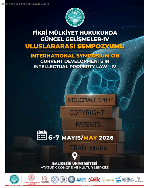 Balıkesir Üniversitesi ev sahipliğinde, Kültür ve Turizm Bakanlığı Telif Hakları Genel Müdürlüğü, Türk Patent ve Marka Kurumu ve İstanbul Sabahattin Zaim Üniversitesi'nin destekleriyle; Taşkent Devlet Hukuk Üniversitesi, L. N. Gumilev Avrasya Milli Üniversitesi, Kuzey Makedonya Uluslararası Vizyon Üniversitesi, Özbekistan Karakalpak Devlet Üniversitesi, MÜ-YAP Bağlantılı Hak Sahibi Fonogram Yapımcıları Meslek Birliği ve Türkiye Basım Yayın Meslek Birliği (TBYM) ile işbirliği içerisinde, 6-7 Mayıs 2026 tarihlerinde Balıkesir Üniversitesi konferans salonlarında fiziksel olarak (yüz yüze) "Fikri Mülkiyet Hukukunda Güncel Gelişmeler - IV Uluslararası Sempozyumu" düzenlenecektir.