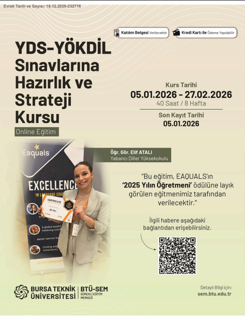 Bursa Teknik Üniversitesi Sürekli Eğitim Uygulama ve Araştırma Merkezi Müdürlüğü bünyesinde açılması planlanan "YDS YÖKDİL Sınavlarına Hazırlık ve Strateji Kursu" Online yapılacak olup son kayıt tarihi 05.01.2026 olarak belirlenmiştir.