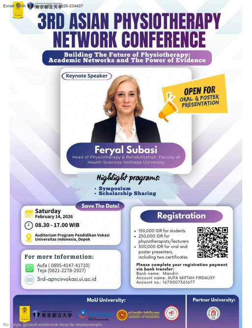 Amasya Üniversitesi, Tokyo Metropolitan Üniversitesi (Japonya), Srinakharinwirot Üniversitesi (Tayland), Peradeniya Üniversitesi (Sri Lanka), Endonezya Üniversitesi ve Esa Unggul Üniversitesi (Endonezya) iş birliğinde; 14 Şubat 2026 tarihinde Endonezya Üniversitesi ev sahipliğinde "3. Asya Fizyoterapi Ağı Konferansı (3rd Asian Physiotherapy Network Conference)" gerçekleştirilecektir.