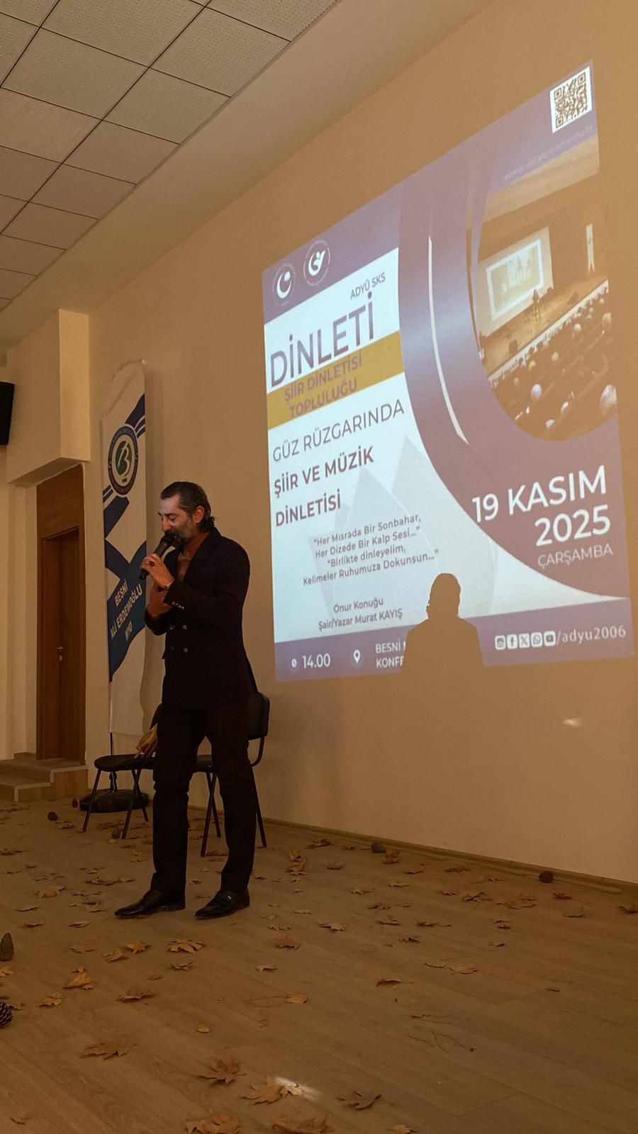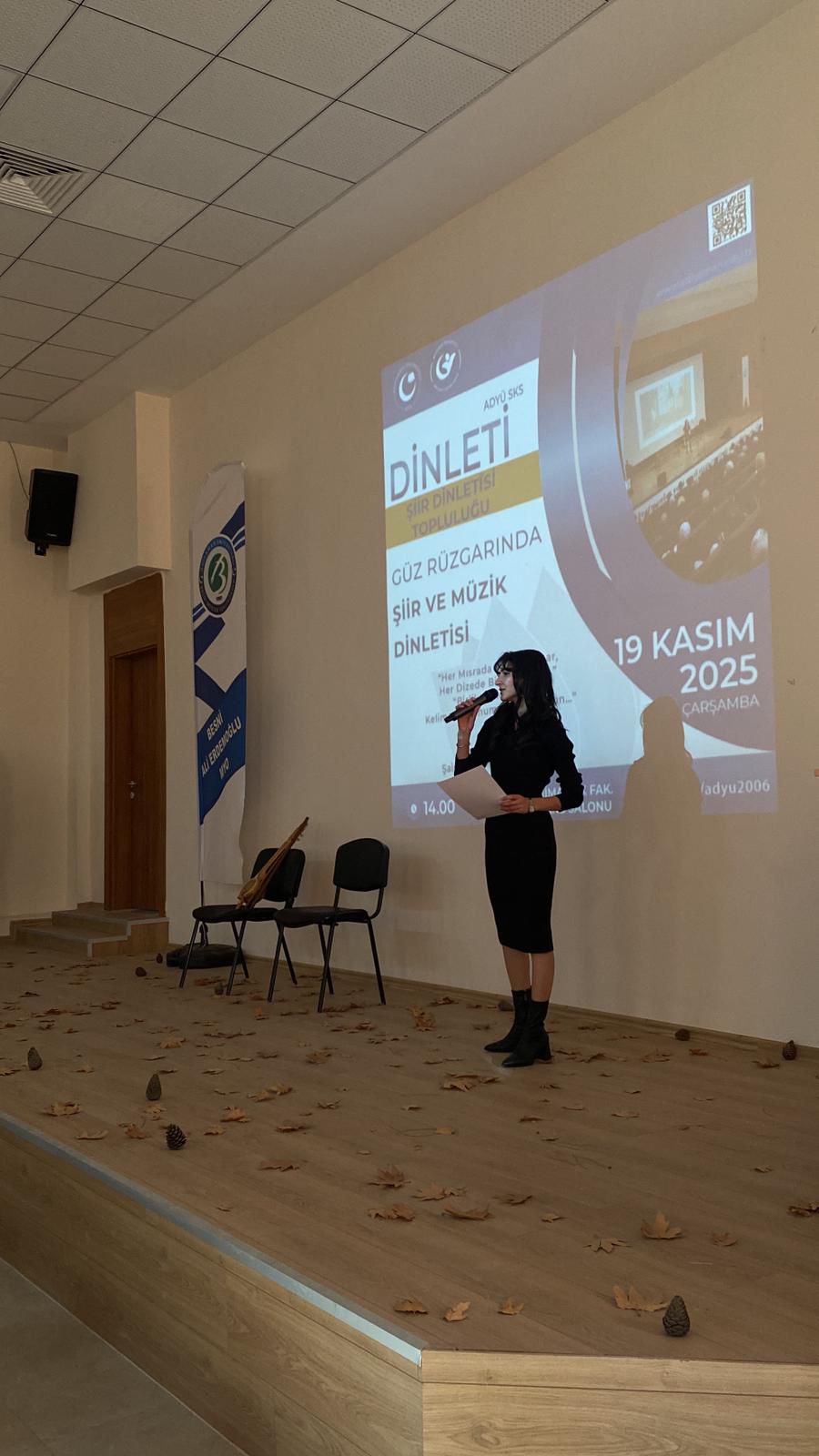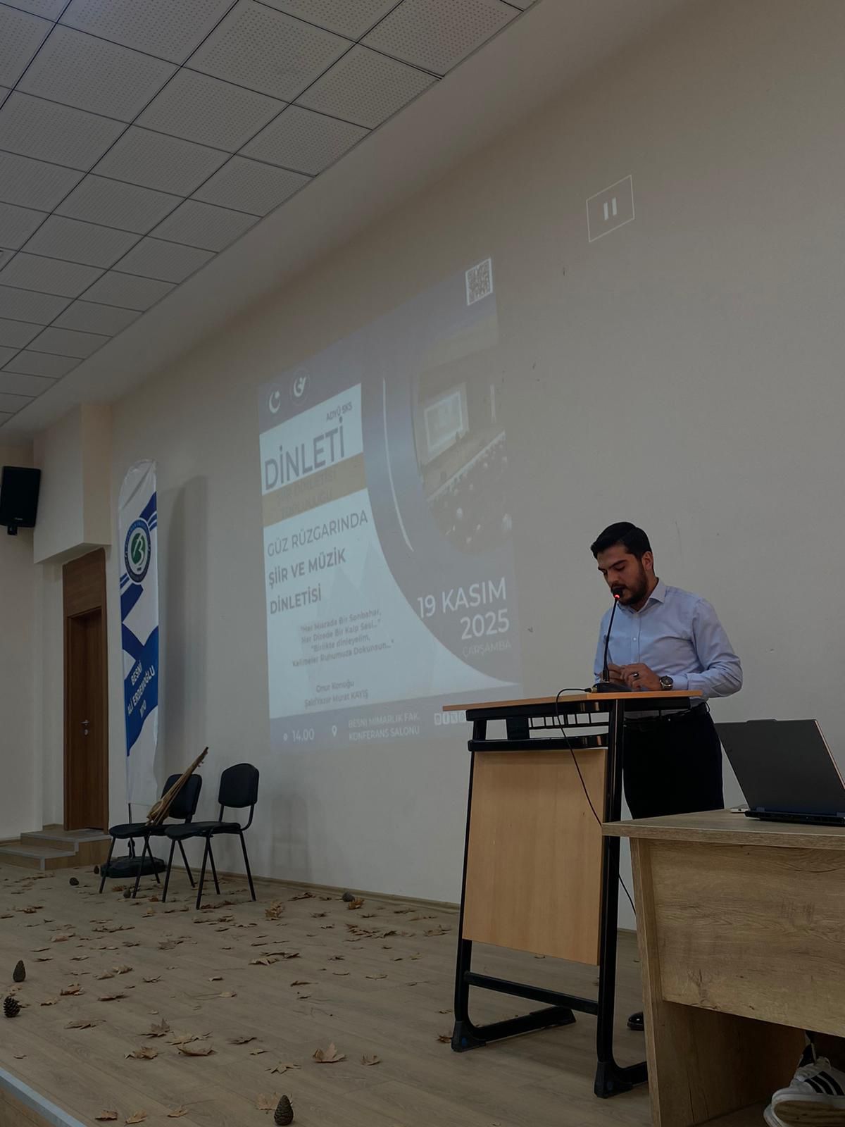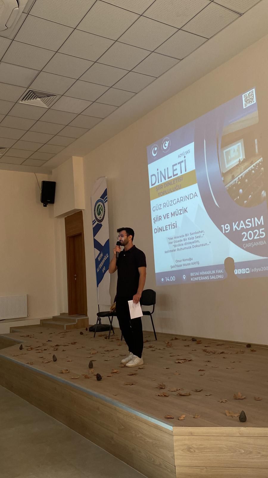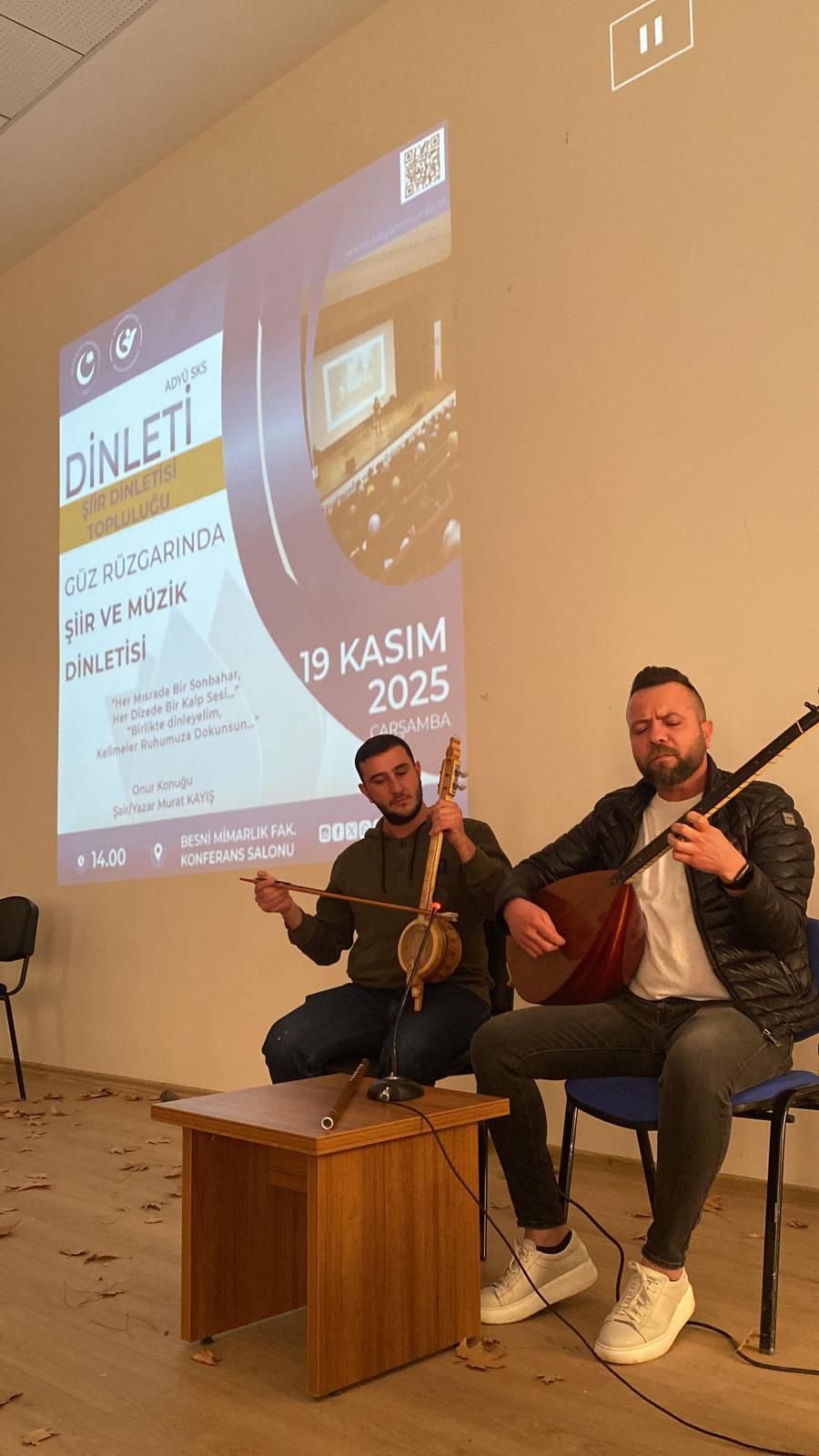 Arş. Gör. İpek Turan yürütücülüğünü yaptığı Üniversitemiz Şiir Dinletisi Topluluğu tarafından düzenlenen “Güz Rüzgarında Şiir ve Müzik Dinletisi” etkinliği, Besni Ali Erdemoğlu Meslek Yüksekokulu Konferans Salonunda gerçekleştirildi.